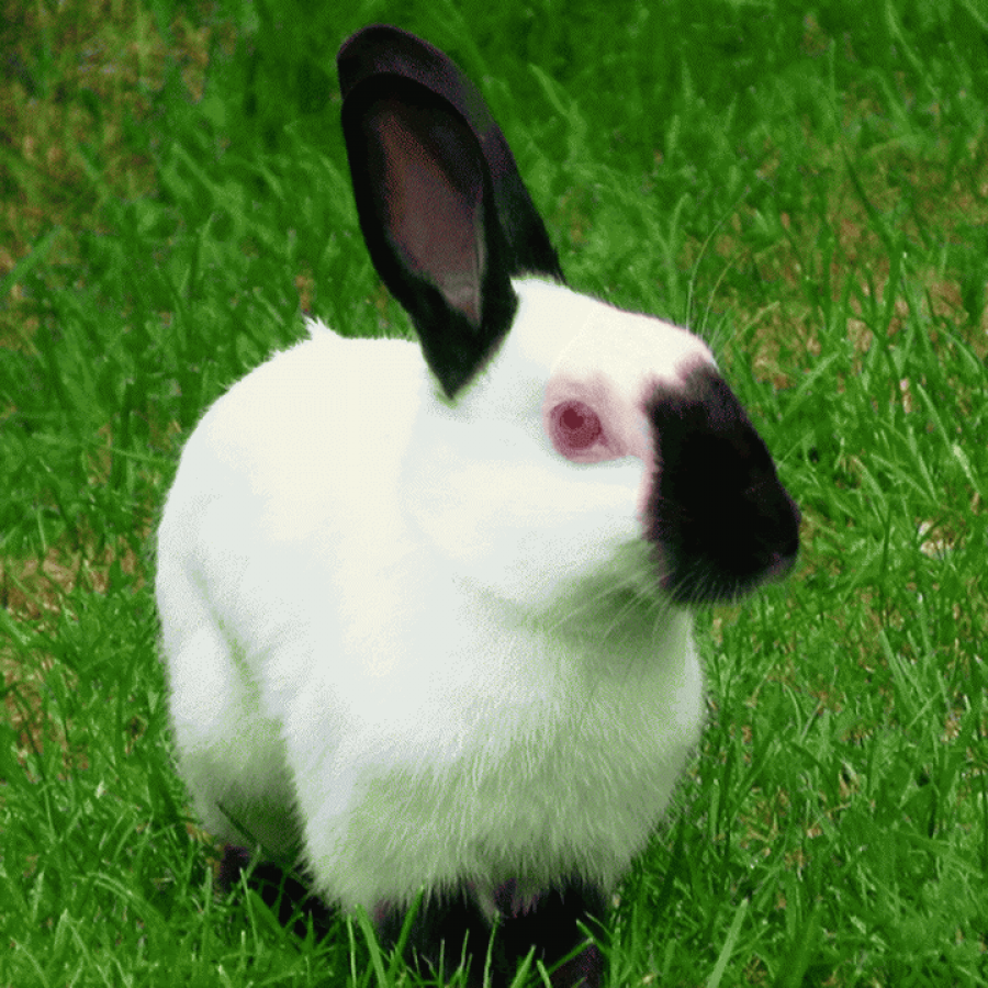 Самое главное, что отличает эту породу от всех прочих — это специфический окрас. Почти всё тело этих животных покрыто густым белым мехом и лишь мордочка, ушки, лапки и хвостик окрашены в черный цвет. Темные пятна хорошо очерчены, отчетливо заметны и симметричны. Также следует отметить, что калифорнийский кролик на фото и в жизни всегда легко узнаваем по красным глазам.